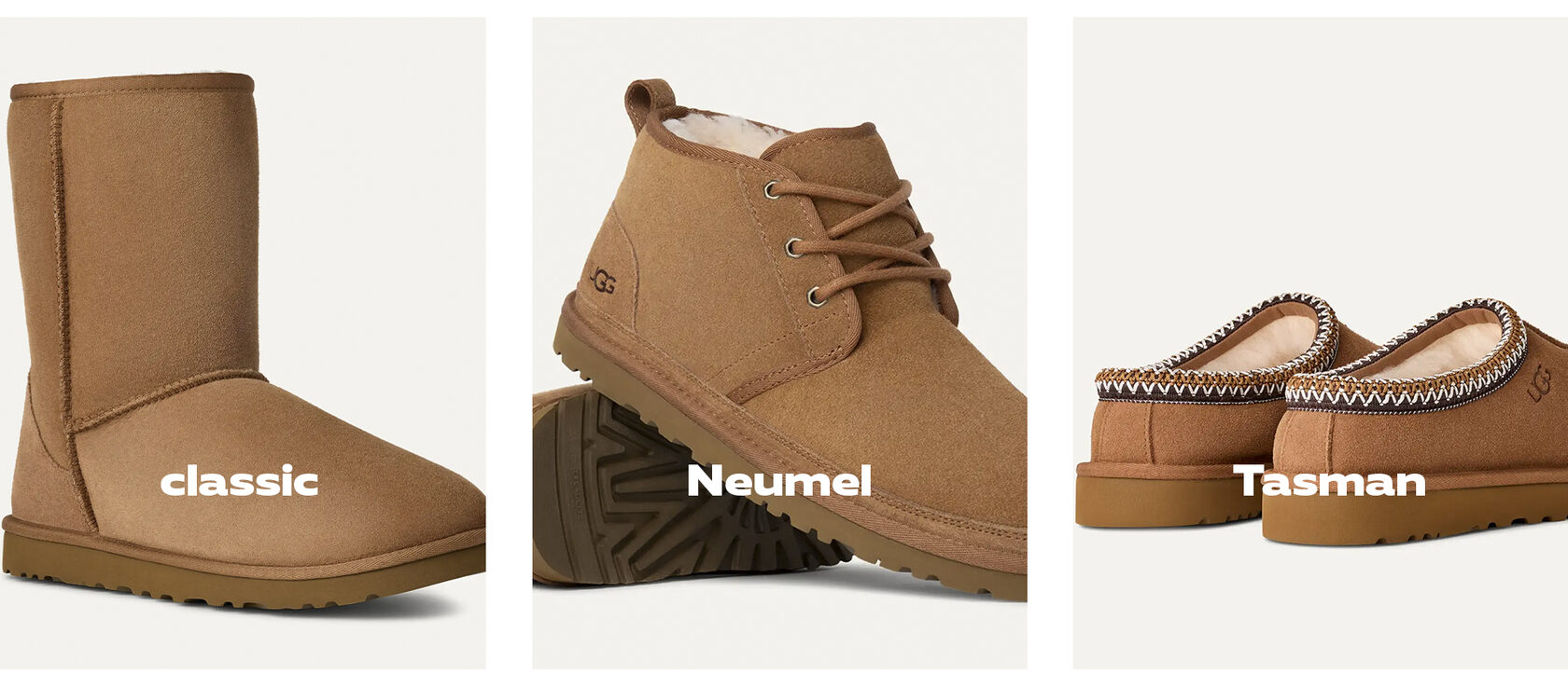 Ugg можно разделить на 3 вида: классические разной высоты, сабо Tasman и угги со шнурками Neumel. UGG можно носить не только женщинам, но и мужчинам.